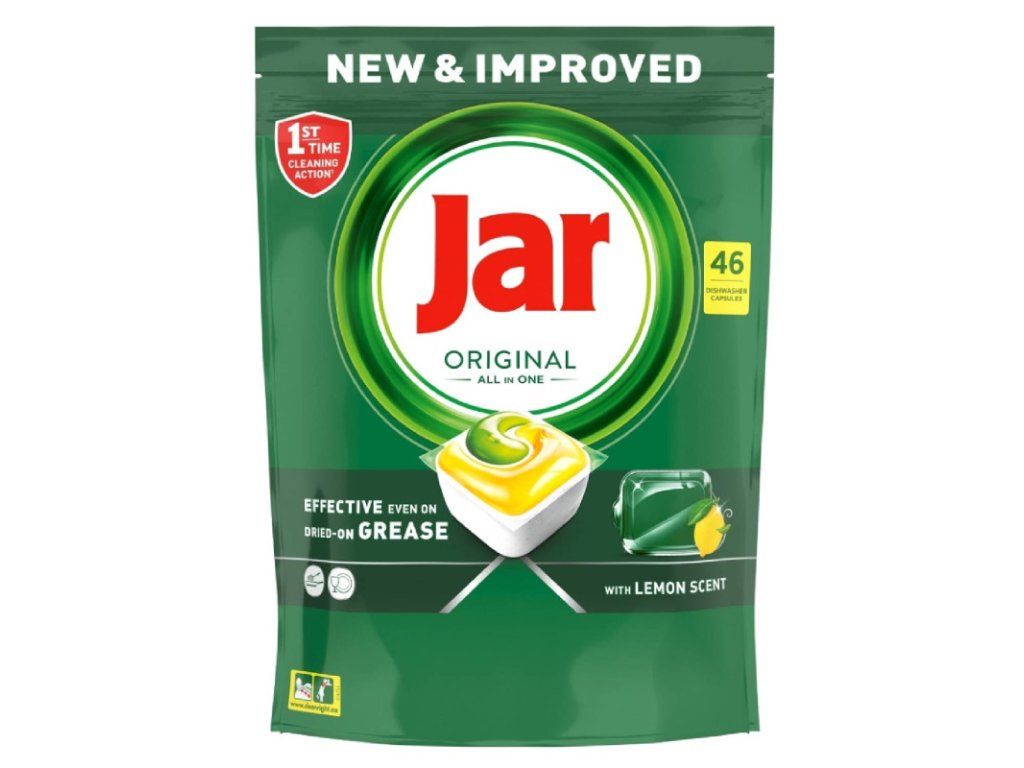 JAR Tablety do umývačky Original All-in-One Yellow 46 ks Jar v sebe zlučuje tekutý aj práškový čistiaci prostriedok v jednej účinnej kapsule. Vysoko rozpustný obal sa rýchlo rozpúšťa, takže riad sa začína ihneď umývať. A navyše sa kapsule tak ľahko používajú! Kapsulu nie je potrebné rozbaľovať a stačí ju len vložiť do priehradky umývačky na umývací prostriedok. Vlastnosti produktu: Kapsule Jar Original si poradia aj s odolnými nečistotami hneď pri 1. umývaní Obsahujú soľ a prostriedok na oplachovanie s ochrannou funkciou pre sklo a striebro Udržujú umývačku riadu sviežo voňavú a čistú Vysoko rozpustná kapsula sa rýchlo rozpúšťa Zloženie produktu: 5-15% Neiónové Povrchovo Aktívne Látky, Bieliace Činidlá Na Báze Kyslíka,Buďte prvý, kto napíše príspevok k tejto položke.